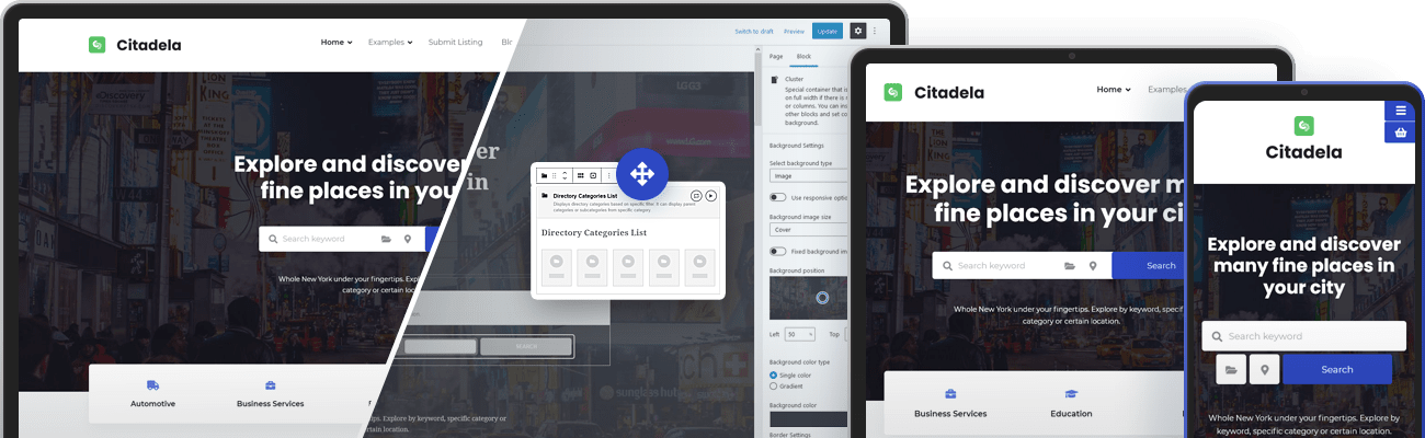 In Citadela layouts, everything is built with blocks in WordPress Block Editor. Whole Citadela package including theme, Blocks, Pro and Directory plugins offers wide variety of blocks with great customizability to achieve everything you see here and more.